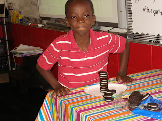 We have been busy working on a special project. The project is called the O.R.E.O. Project – which stands for Our Really Exciting Online Project –and is hosted by a teacher in Southern California. This will be her 13th year of hosting this project. Since 1999, students from every state in the US, almost every Canadian province, and several other countries have participated in this project and submitted their results online to share with each other. Each student will have 2 chances to stack as many oreos as they can. (There are certain rules involved that were explained when we hosted the project in our classroom.) After every participant has recorded their stack counts, we will take everyone’s highest count and average them together for ONE CLASS AVERAGE. Then submit them to the Projects by Jen webpage and compare our results.